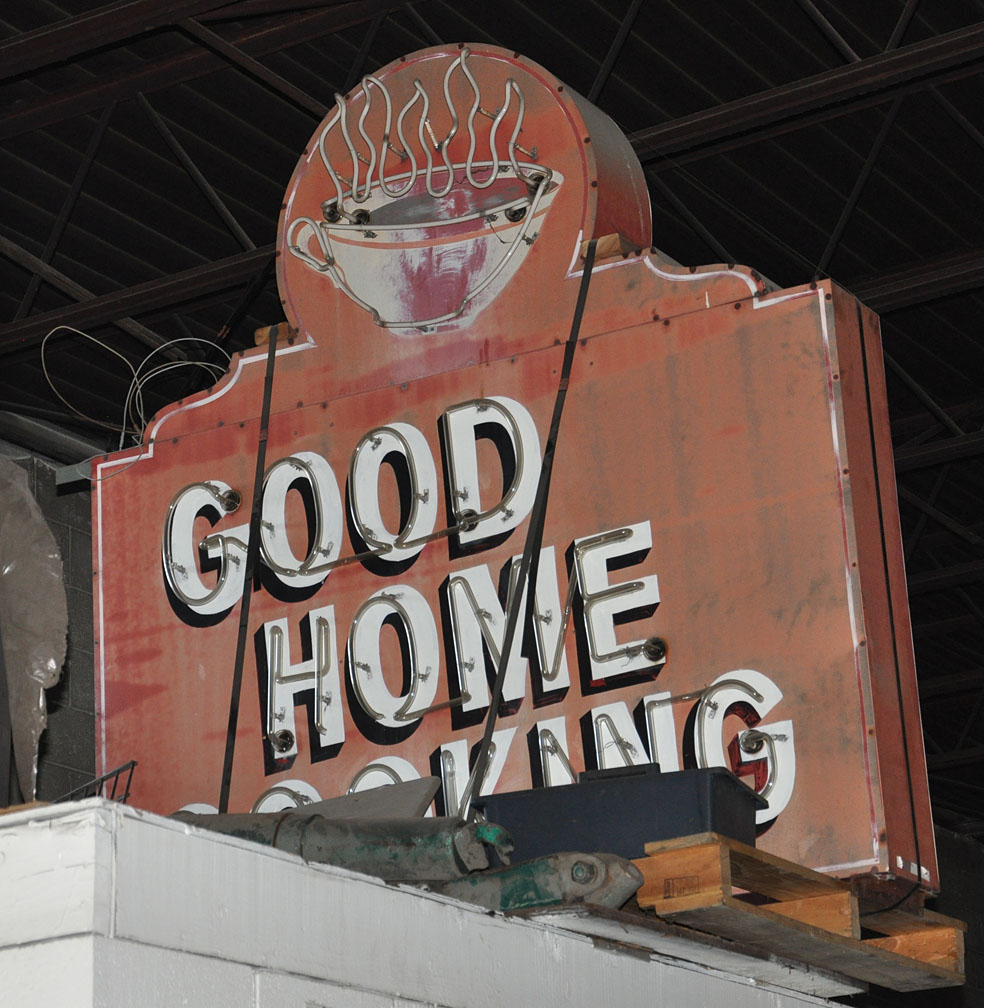 OK, little story with this one. I had heard awhile back that the old Galley Restaurant “Good Home Cooking” sign had been saved and was at Red’s Towing. So, I went to check it out. Rather than subject you to my crappy photo, I refer you to this blog which has some photos of the sign in place and some interesting info about its clone(s):