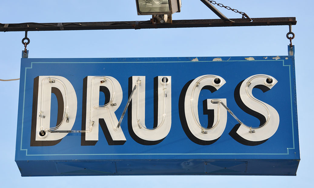 This “DRUGS” sign had a few tell-tale rusty bits and dings on the sides that had been painted over — so I’m going with this one being nicely refurbished rather than a replication or imitation: