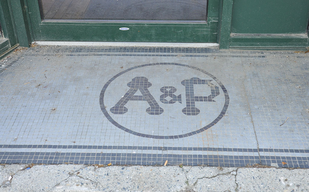 A door or two down, the remaining tile at the entrance of an A&P supermarket: