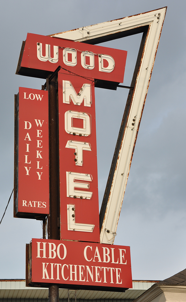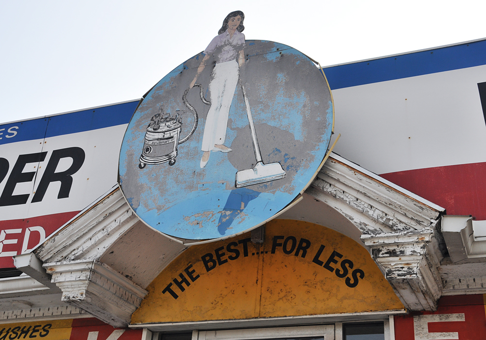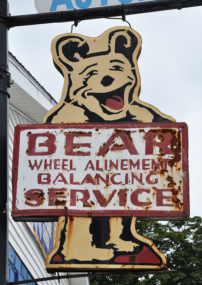 A rusty crusty alignment bear (Bear Manufacturing) sign at Zorn’s Service in Ida: