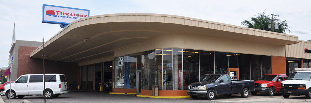 Then over the border into Michigan where I came to my senses. By 11 am, the dogs had already been for two big swims but we were all panting and delirious from the heat. 80s and climbing. So when I noticed an open Firestone store, that was that. Decided to sacrifice the start of a gorgeous, sunny day. I’ve had very good luck with tire stores & Pep Boys repairs — and since this Firestone was one of the rare streamline moderne types, I felt it was a good omen. (Yes that’s Sparkle on the left, ready to roll):