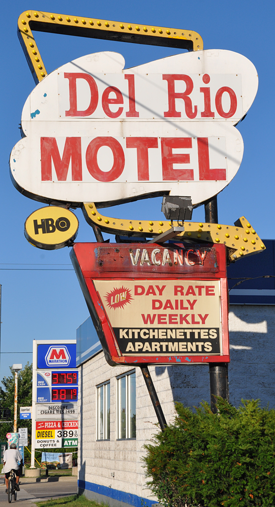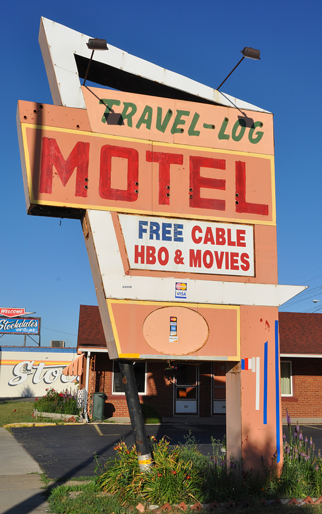 Enough babbling — on with the photos. From Battle Creek — a nicely maintained mid-century porte-cochère (I hate it when people use that word, so I will for a laugh). I don’t know what it was originally but Econolodge is there now. The style looks familiar but I can’t place it. Anybody?