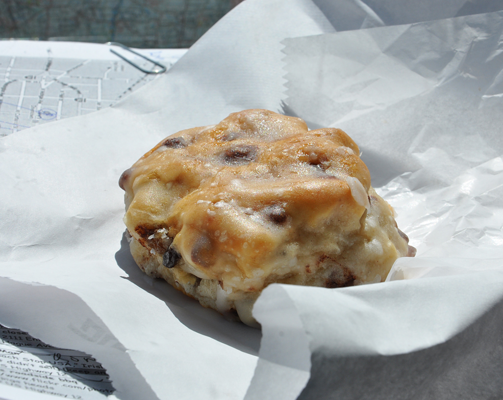 Finally! Dashboard time. Time to put some sugar in my system. This from the Corner Bakery in Jackson — what they call a raisin biscuit. The guy working there recommended a 60-second microwave procedure. So I went for it. Mmmy melt in yer mouth. Could have eaten 3 more easily but only bought the one (wisely).