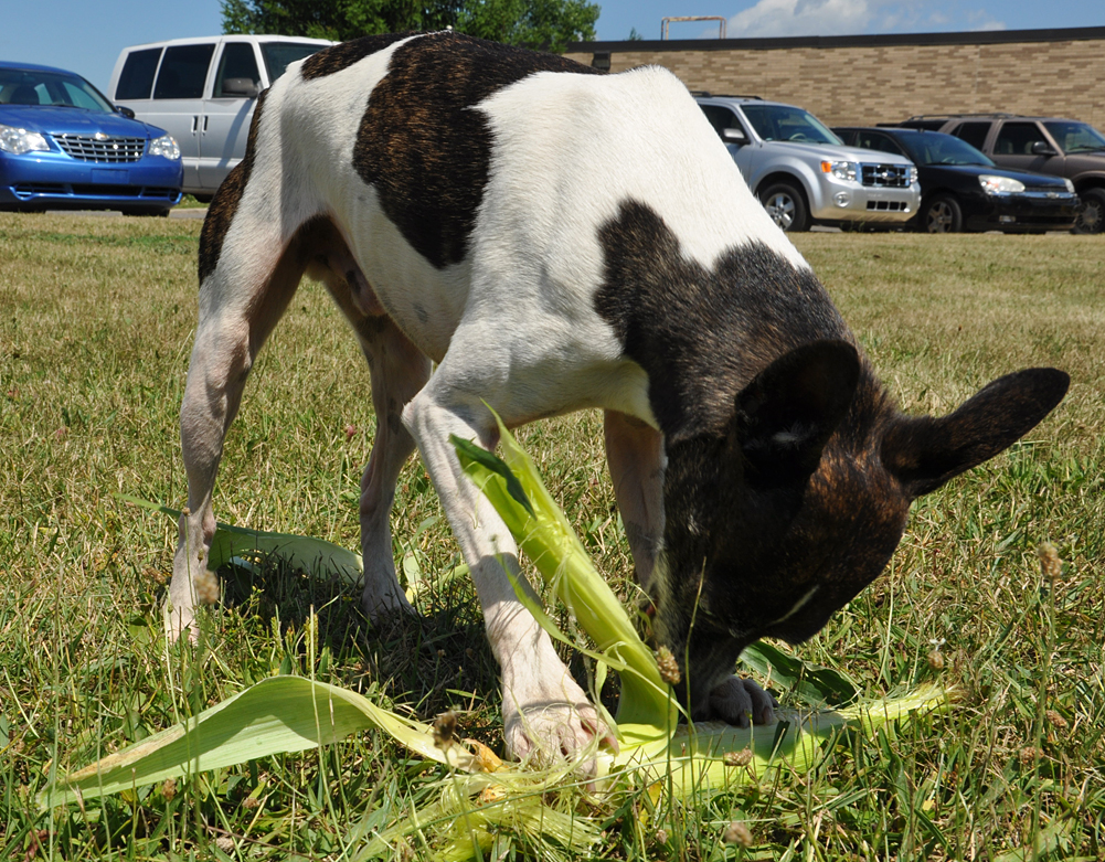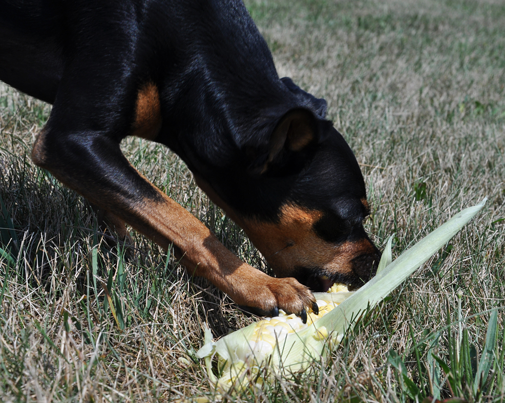 Gave the dogs a treat, too. Roadside stand sweet corn. The “seniors”, Grip and Fix, were not at all interested so they didn’t get any photos. Will have to showcase them tomorrow. Nik is expert and pulling back the “skins” (no foodie here, must be a better name, husks?).