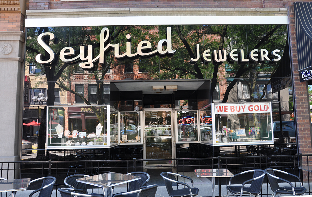 From Ann Arbor — hard to tell since there’s so much reflecto going on — but that’s all gleaming black vitrolite. The jeweler still open — just tables & chairs from the restaurant next door.