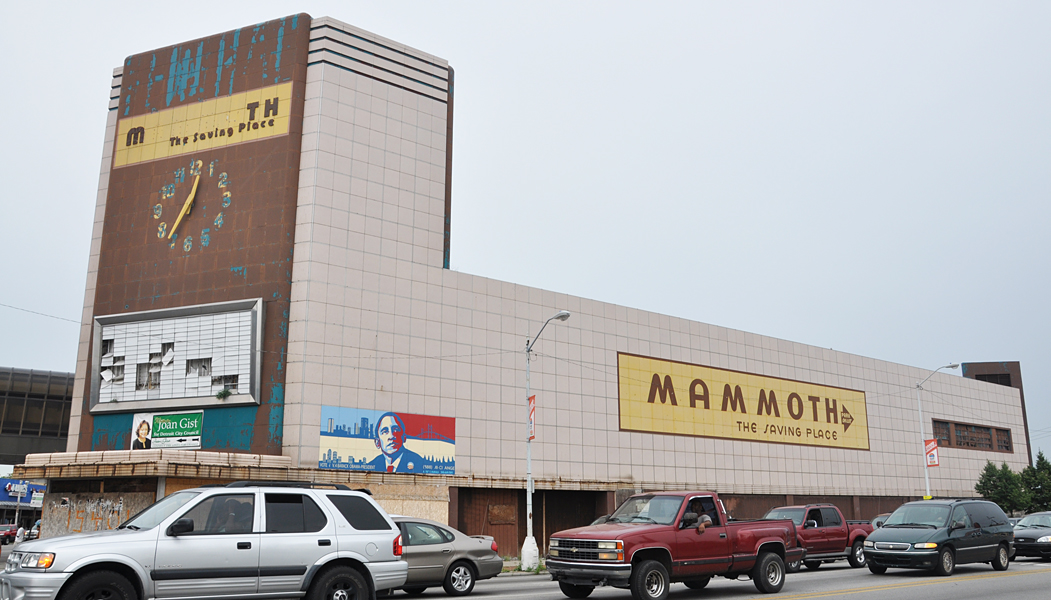 Some of these gigantic buildings in Detroit hit you on so many levels: the sadness of their condition, the miraculousness of their survival, their beauty in both their decrepitude and how they must have been way back when, the mysteries of their histories… Sorry getting late here and the gloomy day has me wistful. Poking around on-line, it appears this was originally a Federal Department Store, later a Mammoth Mart: