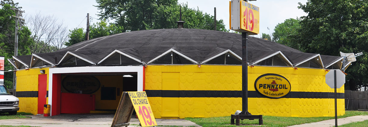 The coolest discovery all day. A mid-century oil change place which I assumed was probably a bank or church originally. But no, I’m told it was built as a muffler shop. There are 12 bays set around a turntable in the middle. The cars would be driven to the center and then spun by the turntable to point at and be driven into the desired bay. Does that make sense?