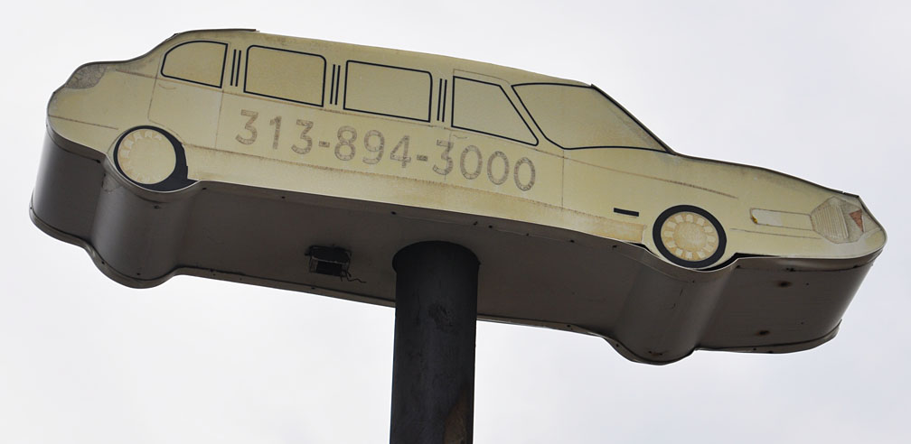 Back in Detroit again — this car on a pole is at Rim City — though there must have been a car limo place there before. Crappy weather, huh?: