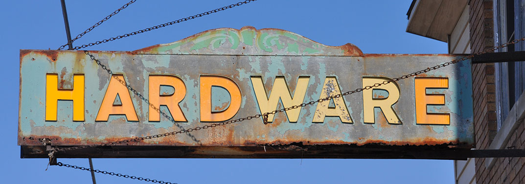 Also in Flint. This hardware sign might have had opal glass letters — if not, then some other translucent material to be lit from inside. There appeared to be plastic for the letters now: