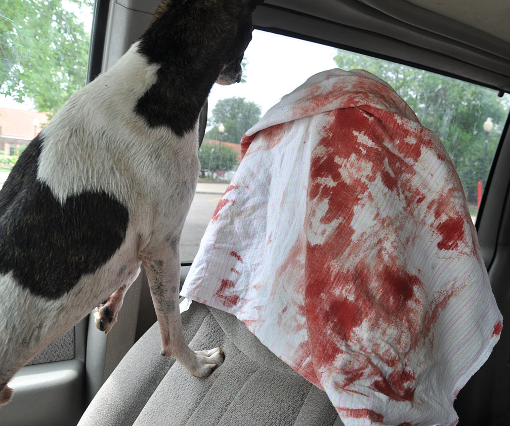No harm came to my glasses or my camera as I had the presence of mind to set them down the second that Nik bolted. Once I had everybody back on leash, I walked out of there calmly, dripping wet from head to toe, like nothing had happened. It was so completely embarrassing. Back in the van, I assessed my injuries. Not good. I had hit the back of my head on the cement at least three times and there was blood pouring everywhere. Here’s the towel from blotting — as Nik looks back in the direction of The Ducks, wanting more!