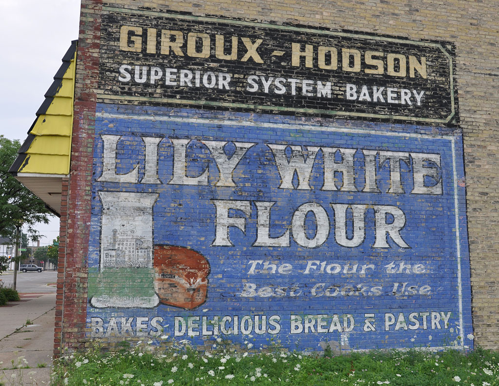 A crudely adapted bakery sign. Looks like it became a “beer” place from the bottom — maybe a bar or liquor store. Probably “wine” at the very bottom of the sign. And the top lettering was changed as well — though not enough to decipher the name:
