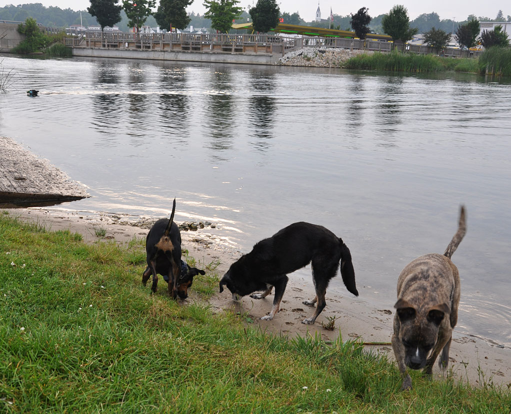 The girls in the foreground munching on some kibble I dropped while Nik bringing a toy to shore at far left. That’s also the Montague Dog n Suds in the far background (yellow canopy):