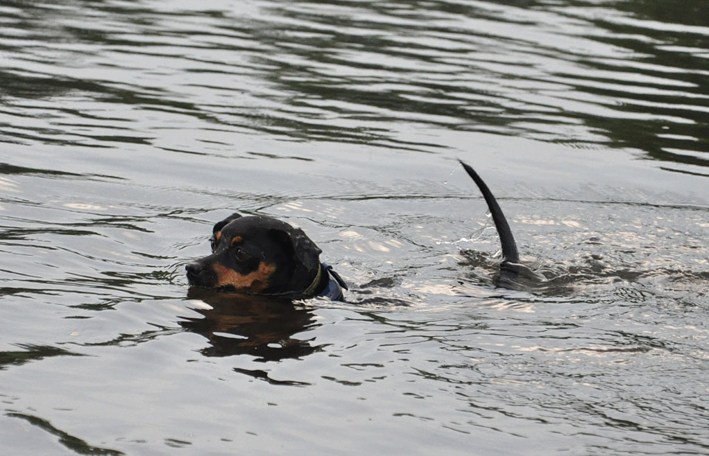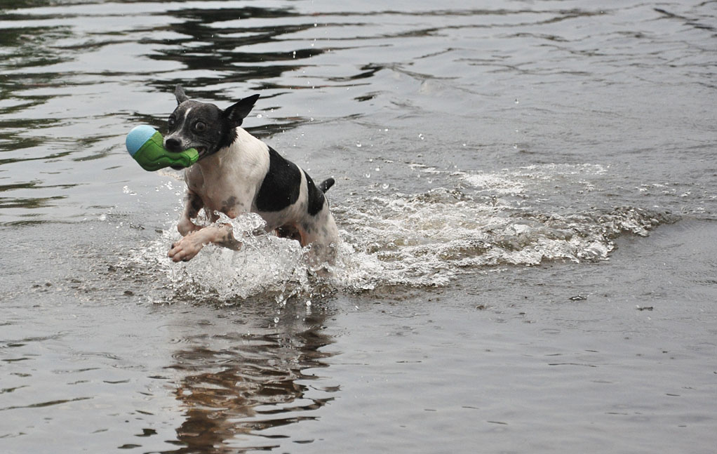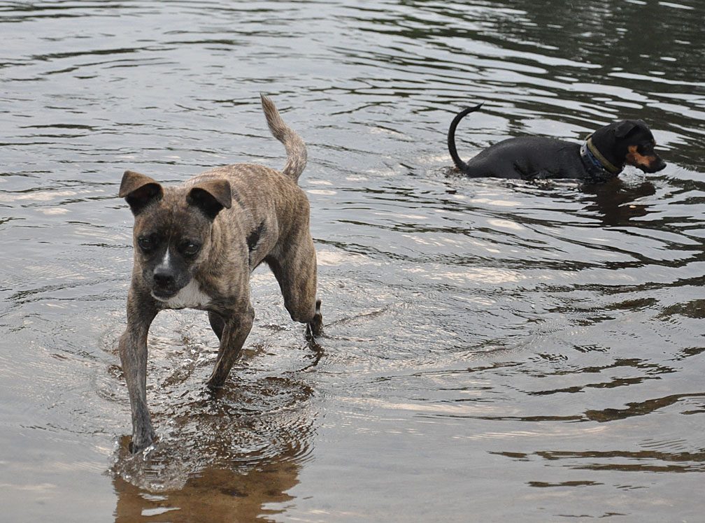 Fixie, on the left, only swims lately if it’s really, really hot — or the treats I’m hurling are really, really good: