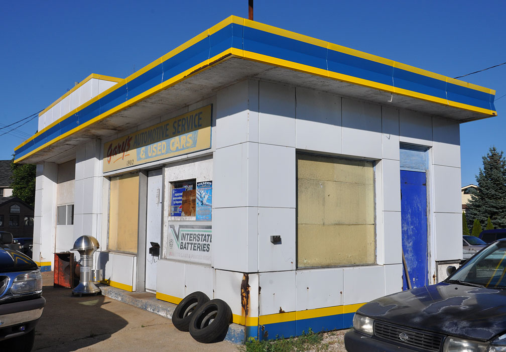 On with it the blue! From Two Rivers – tiny little icebox gas station — now just a repair shop. I don’t know the brand here — not seen a roof with that concave beveling before or that tiny tower on the left. No sign of other colors under the blue and yellow. Does anyone recognize this breed?