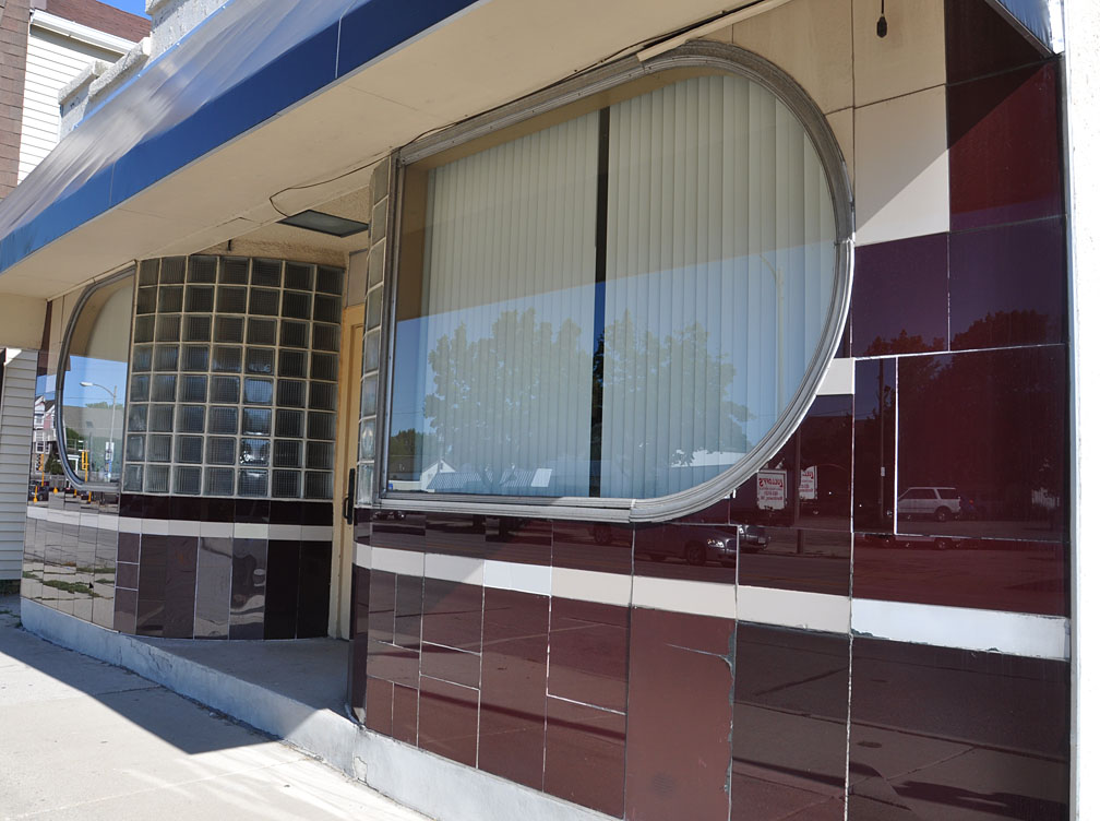 More Manitowoc. This is now a catering business — I don’t know the original occupant. With those windows, it must be 1940s. The vitrolite gets a 2nd place here because of all the crude patching. Some of the tiles were replaced with mirrors and taped over red stuff. But better than missing chunks. I understand replacing this stuff is very expensive.