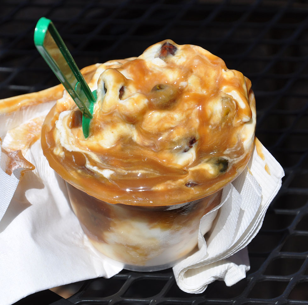 And speaking of ice cream — I did indulge myself in some today. Though I didn’t have hot weather as an excuse. This is actually gelato — mascarpone something with pistachios — and a whole lot of caramel. It looks much bigger in the photo than real life. But I know you want these dive-in close-ups, right? Melty smooth and yummy: