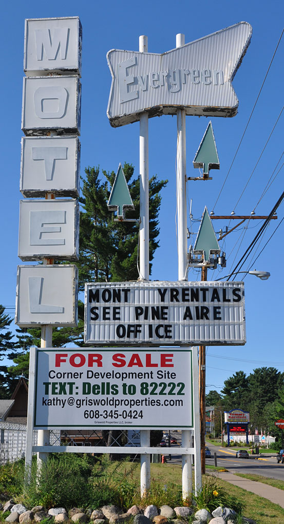Moving on to Wisconsin Dells — the Evergreen Motel is now closed and I fear this sign will be gone very soon. There used to be tons of these unique little motels and signs — but development and property values have just smothered them. There are still a few oldies that survive (the Holiday Motel for instance – see my Flickr photos from tonight). The Dells is all about huge, flashy amusement parks, theme hotels, etc. for college students and families.
