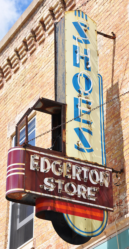 From Edgerton. Sadly, the Red Goose part of the sign is now missing. And the shoe store itself is gone as well. The sign would have looked like this originally: