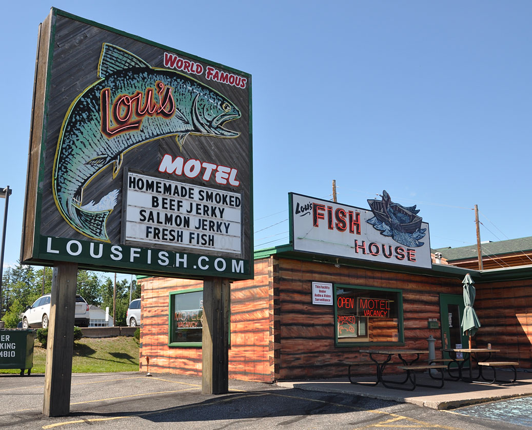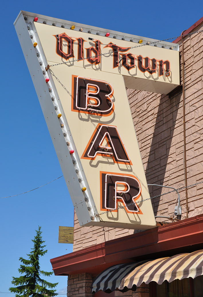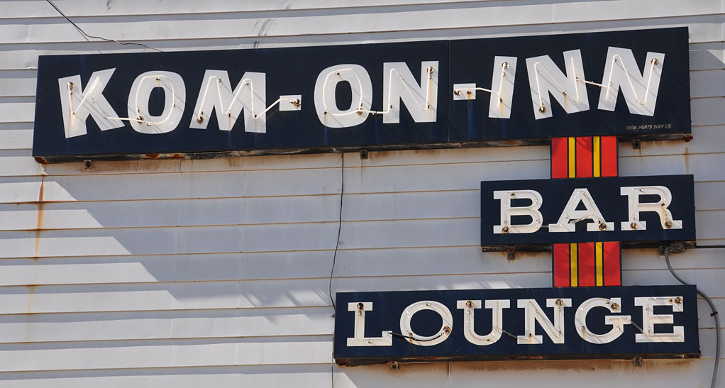 Also from Two Harbors — a bit of neon and wood. Note the building is simply painted to look log cabin-y: