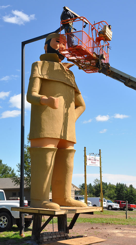 Moving on to Two Harbors. I had heard that the Pierre the Voyageur statue had been moved. Sure enough! I arrived to find him being fitted with spotlights. This is a very happy ending. The statue had been abandoned for years and was soon to be bulldozed when this hotel stepped forward to offer him a home. He was restored and relocated — no easy task since he’s concrete not fiberglass — and twenty feet tall:
