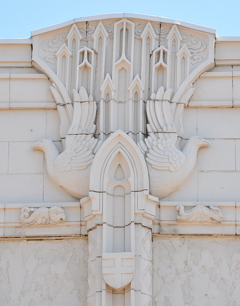 The storefront of this building is a yucky coverup — but the details on top are great: