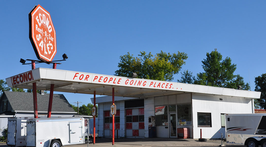 Another fun, former station, let me count the ways. The “people going places” motto, the stop sign shaped sign, the checkerboard bay doors:
