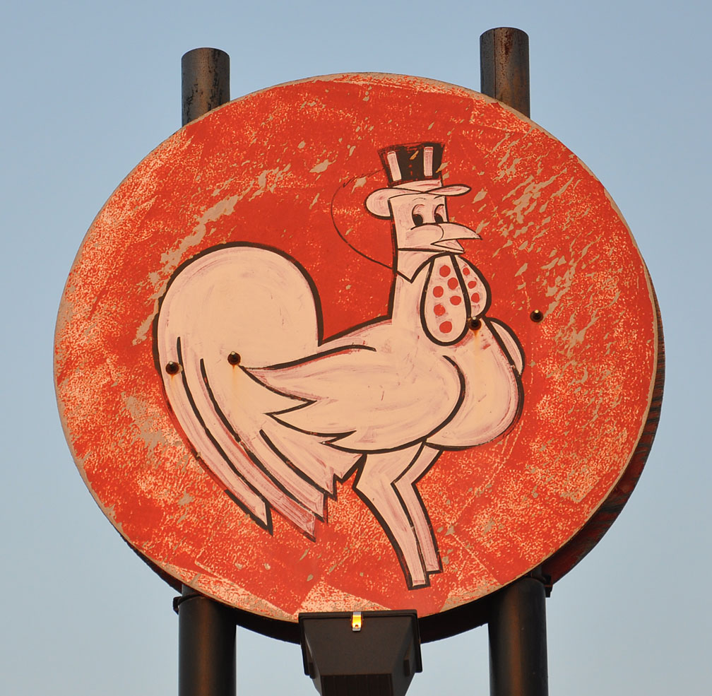 That’s a broaster chicken — looks like this sign had neon. Same top-hatted company chicken / advertising symbol as these statues: