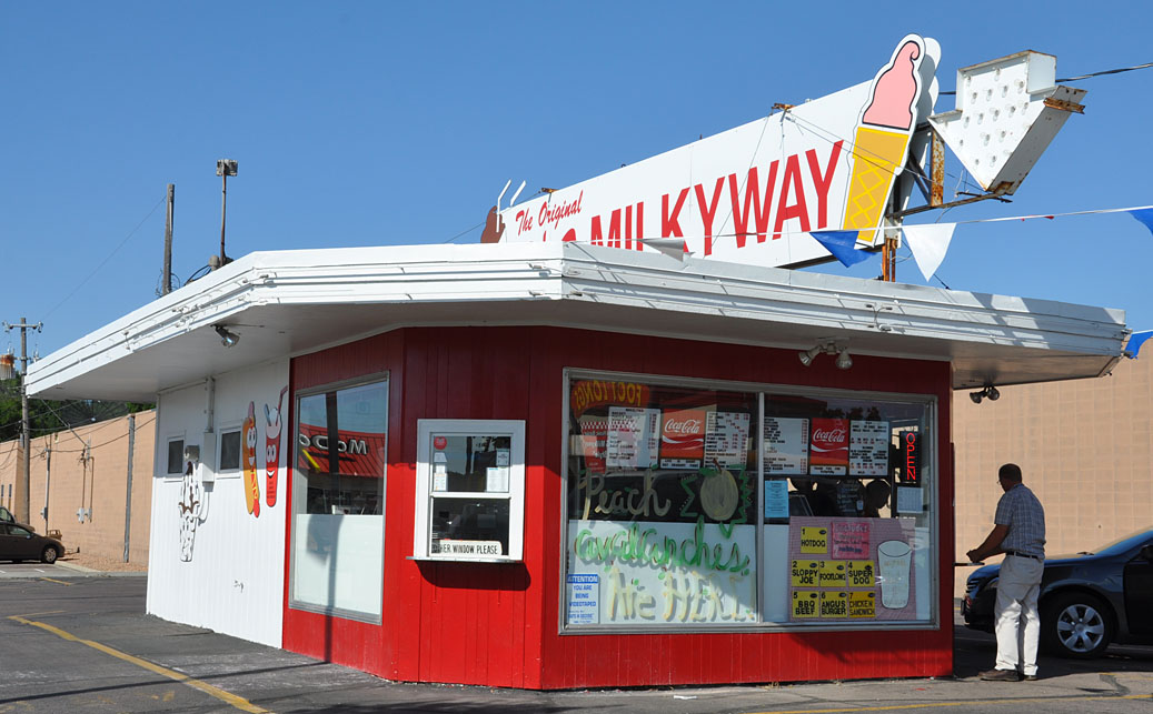 More from Sioux Falls. It was in the 90s today — so ice cream sounded like a good idea. The B&G Milkyway rooftop sign has a tilted cone like Dairy Queen and Tastee-Freez. But I don’t think this place was built as either of those.