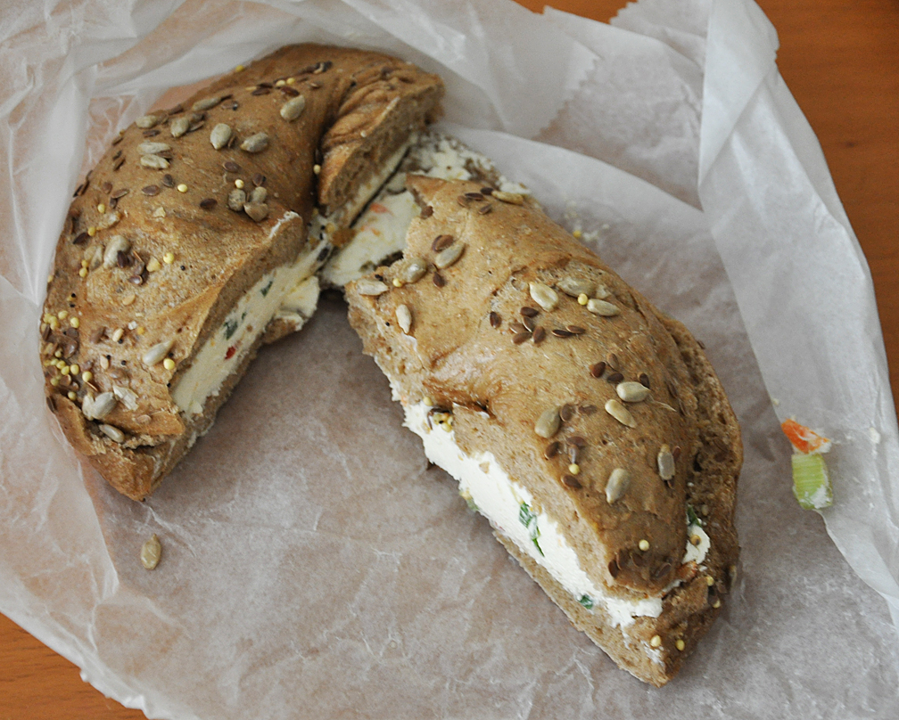 Three Mexican restaurants, a big beer store, a friendly auto mechanic — I’m set! And I discovered what I believe are the world’s best bagels. And god knows, I’ve had thousands! From the “Olde Brooklyn Bagel Shop”, this is a multi-grain with vegetable cream cheese: