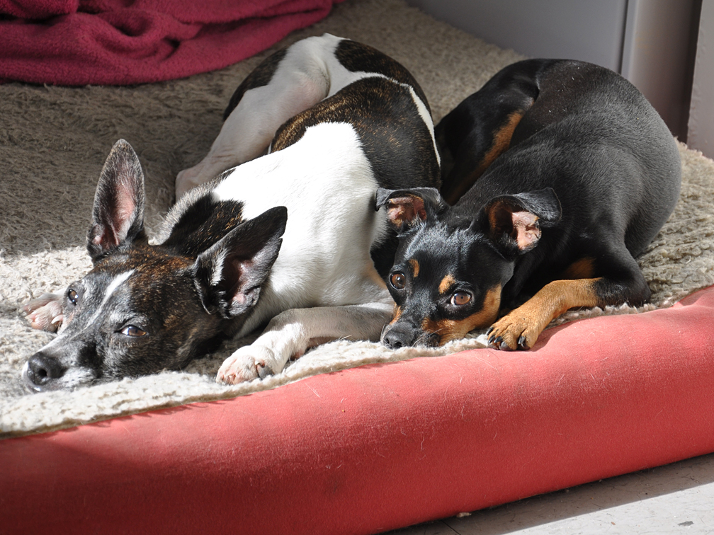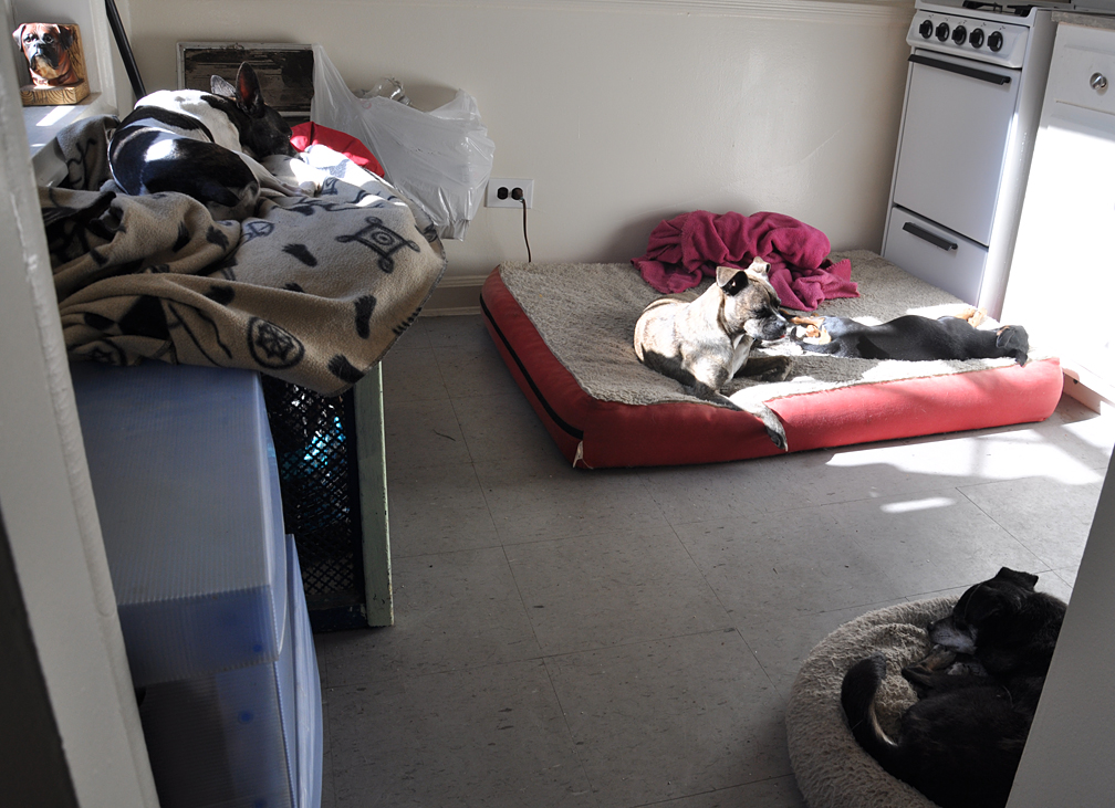 The dogs are adjusting well. Although the view sucks compared to the one we had, there’s no street noise and still loads of sun for basking: