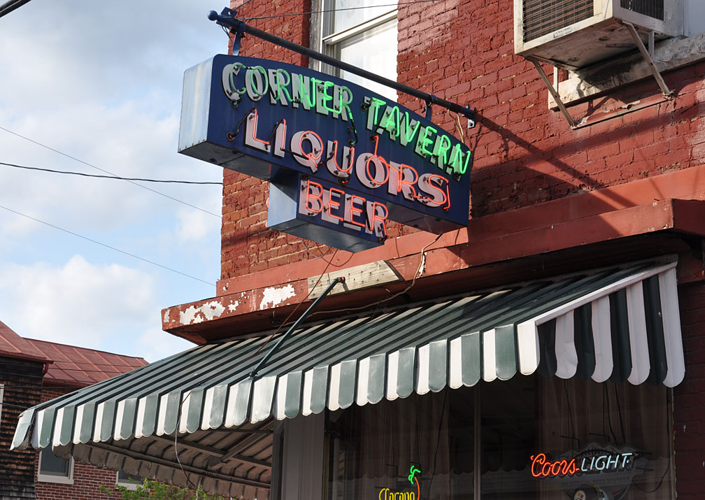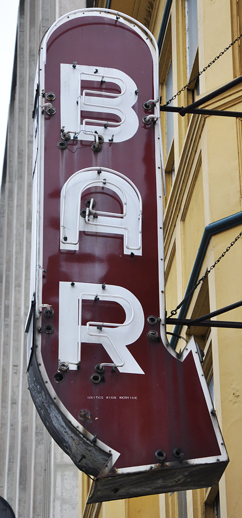 Here’s another brown porcelain enamel sign — and also from 1948. Hmm, same sign company? Same owner? This one is at the Pep Grill. There’s an article about the place being put up for auction last summer — but the bar was definitely open today: