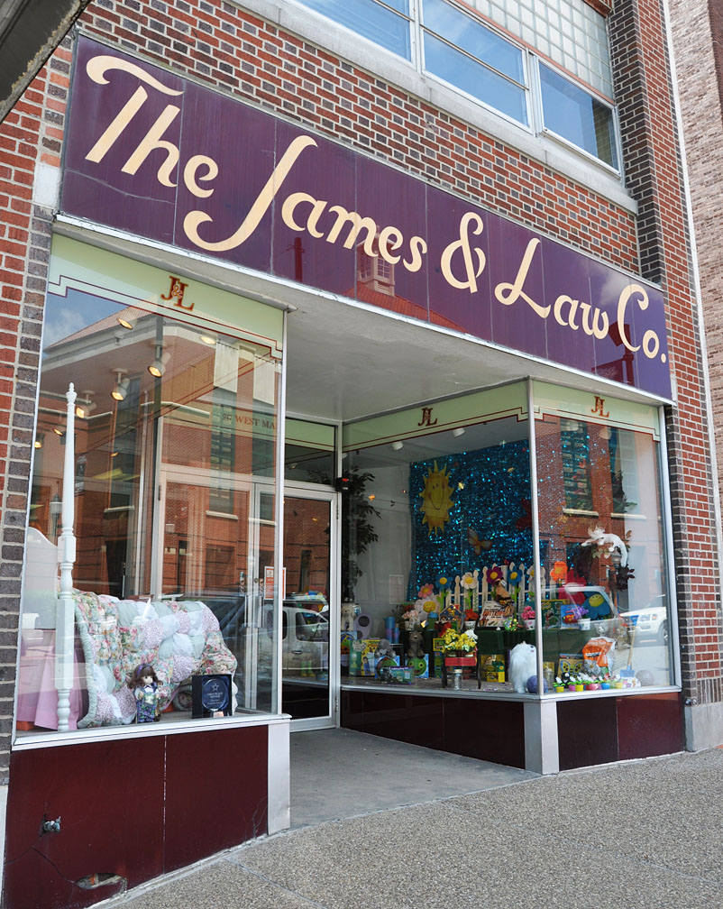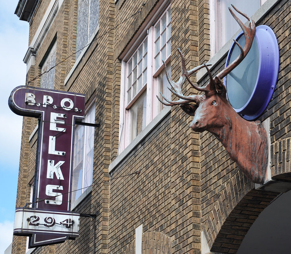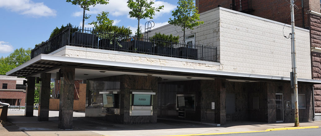 More Clarksburg. Your vitrolite facade du jour — this time with the sign built into the glass: Note the detail at the tops of the windows also: