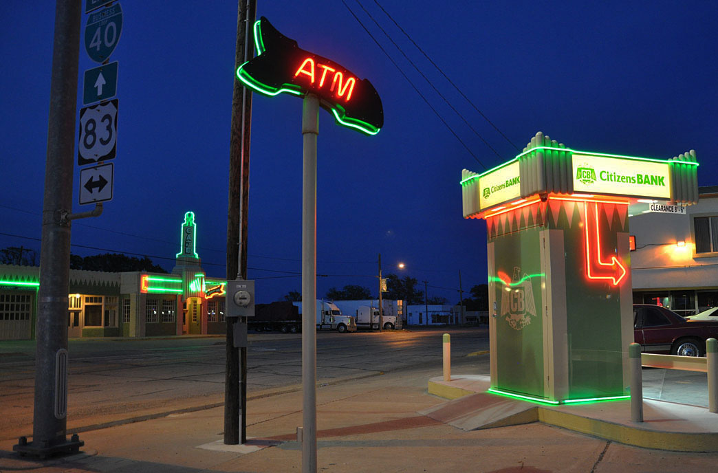 As luck would have it, en route to Amarillo, I was able to catch the neon coming on at the former Conoco station in Shamrock. This is the modern ATM machine across the street built in the same style. Note the ATM arrow sign even mimics the “U Drop Inn” sign across the street: