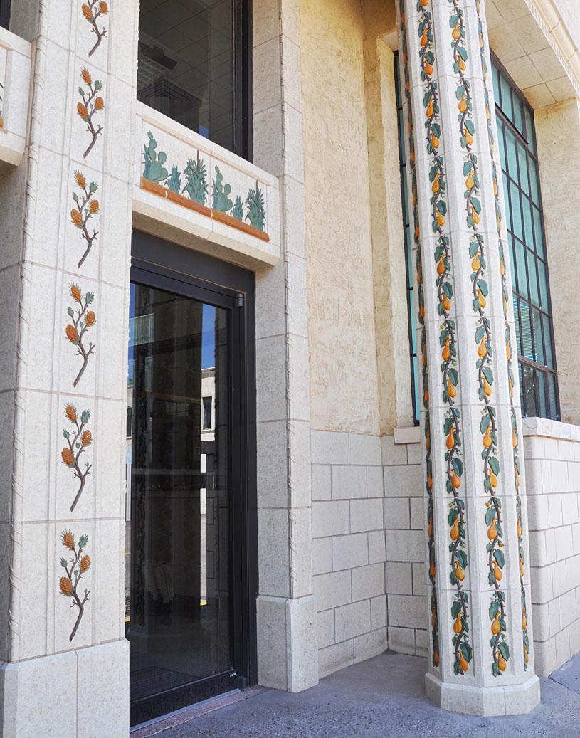 An interesting building I hadn’t noticed before — I’d say Art Deco with neat fruit?, pine cone? & cactus details: