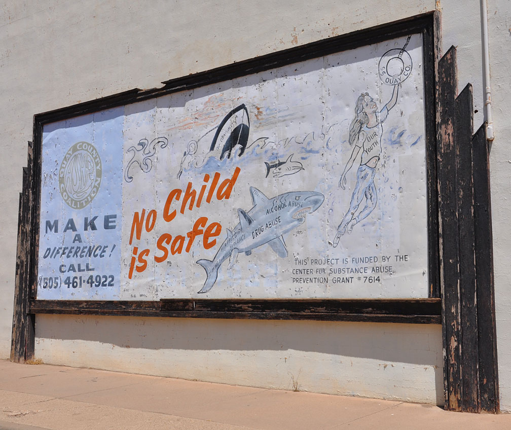 A modern-ish billboard downtown — don’t forget, all my photos are clickable to get a larger size. The shark/drugs chasing the girl/our youth. The boat says “Our Community” on it: