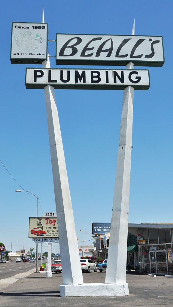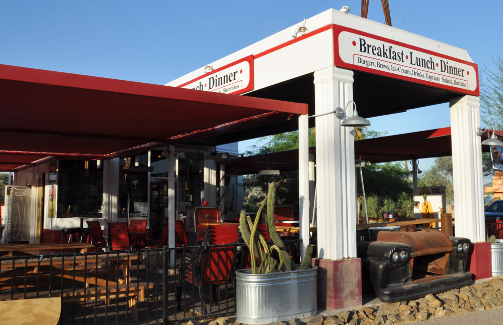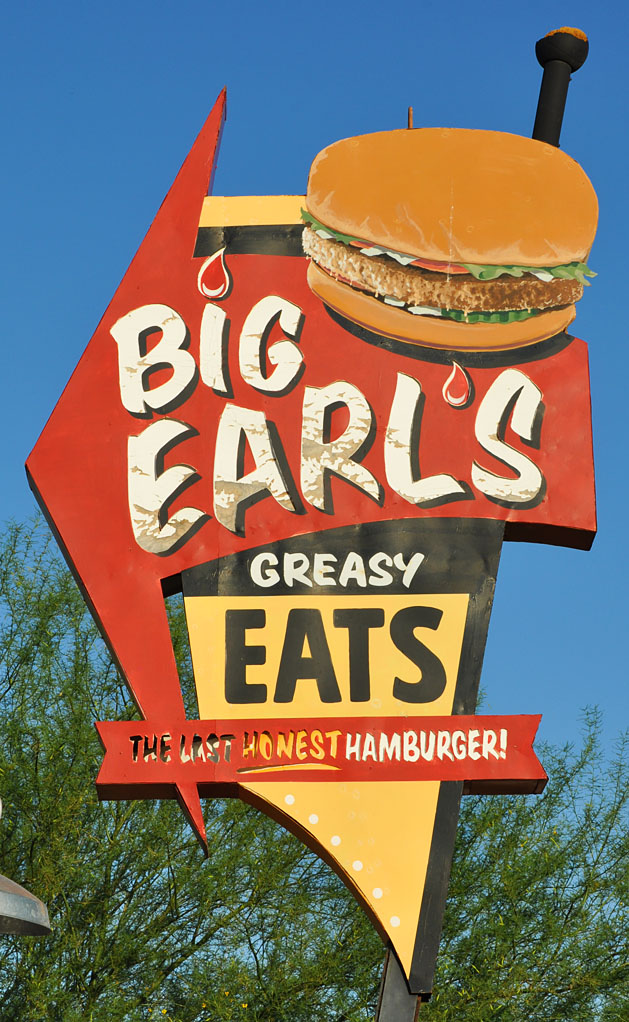 My Phoenix area stuff started in Cave Creek. Big Earl’s Greasy Eats is housed in a former 1930s gas station. It opened here in 1993, But I must have missed it the other two times I was here. This sign appears to be completely new (including the metal) — done in the style-of a vintage sign: