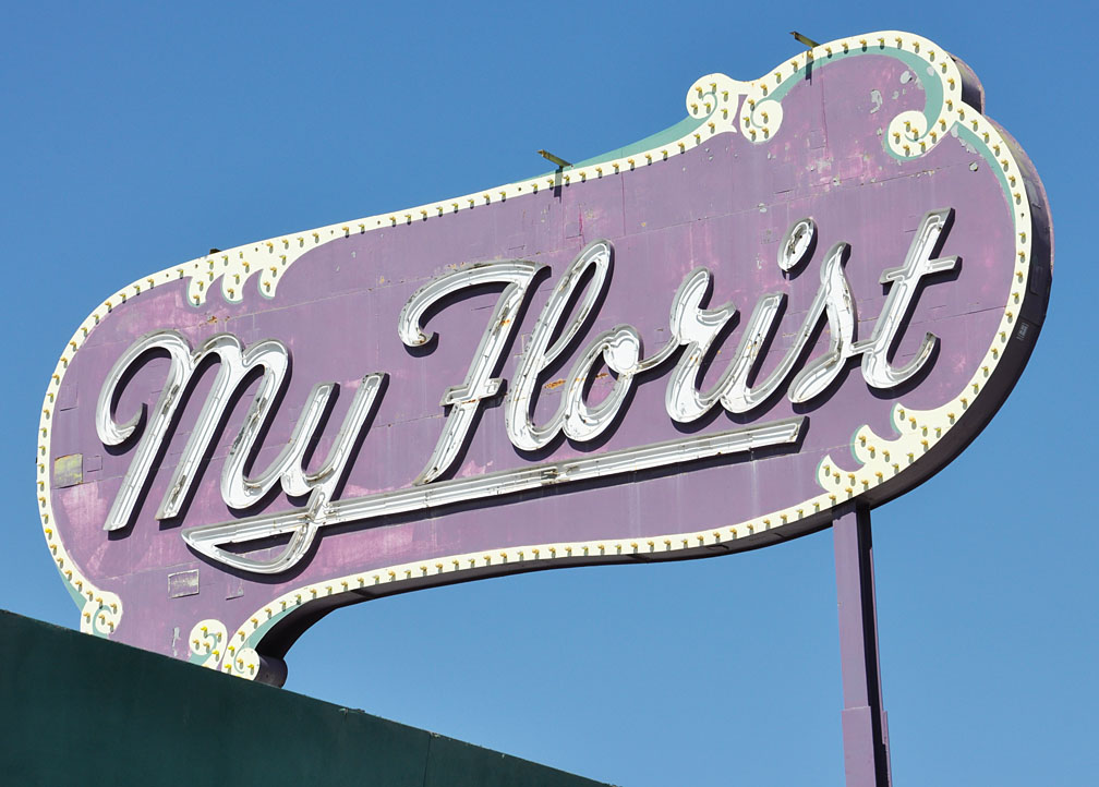This giant rooftop sign was built in 1947. The flower shop closed in 1996. A few years later, it reopened as the “My Florist Cafe” which kept the sign. The cafe closed in 2010 but the sign is still there. It sounds like it might be protected: