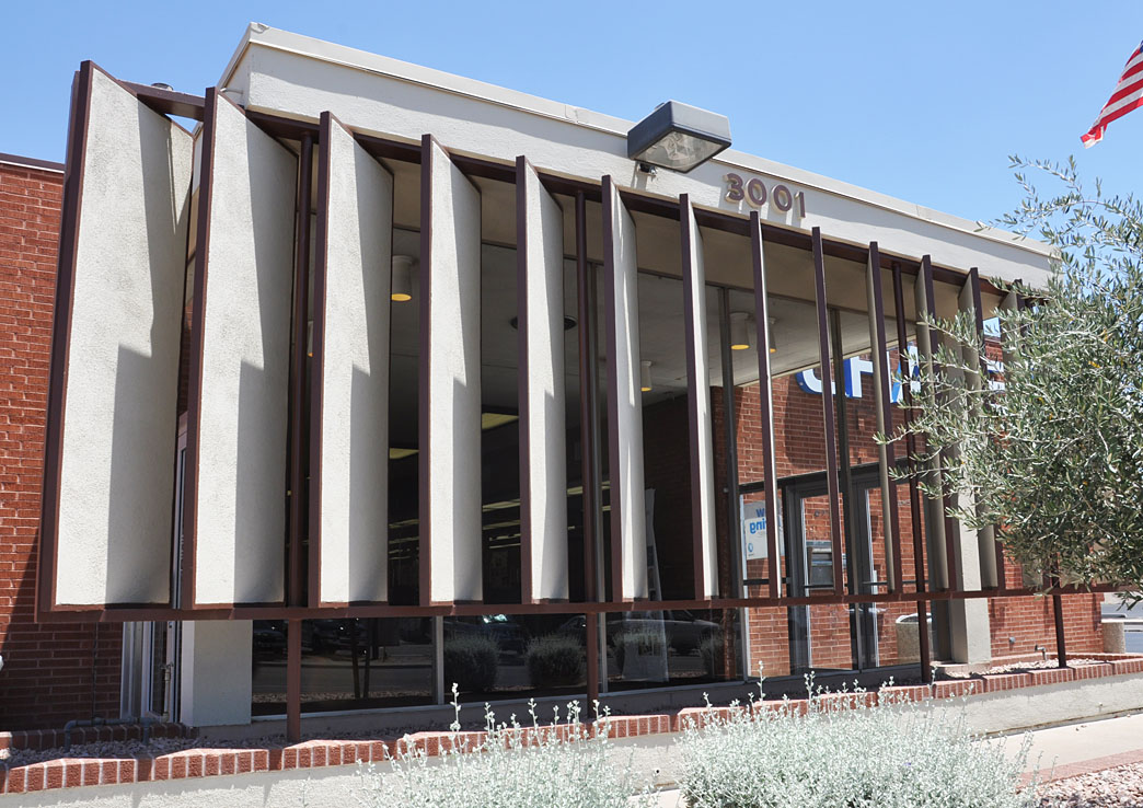 Loads of mid-century modern in Phoenix — and lots of buildings with these louvered screens. I don’t know how many are operable or never used that way. Think Venetian blinds where you can change the angle of the slats to let in more or less light. No need for this really in New York — but with the scorching temps just the past few days, I get why the concept was a hit here. This one at a Chase Bank: