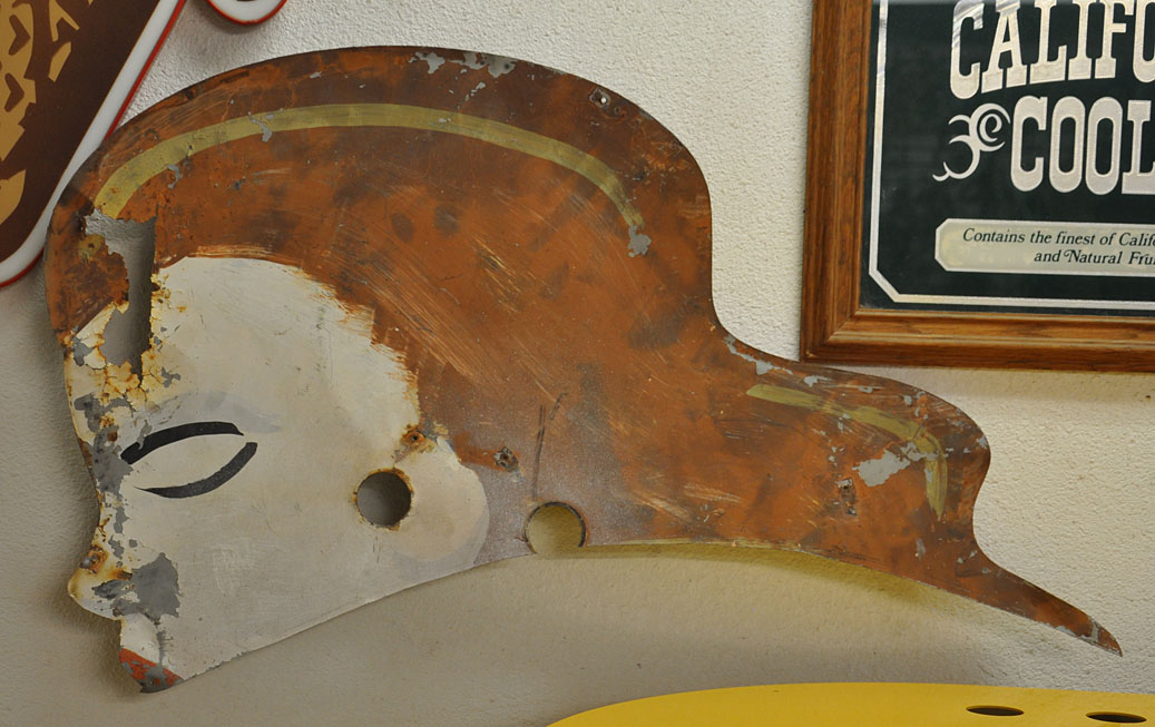 I had hoped to get a look of the restoration-in-progress — but it was in storage in another building. But I did get to see this bit of one of the diving lady’s faces that was too far gone and had to be replaced. This sign had a lot of rust: