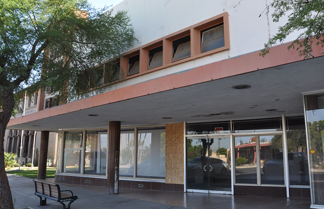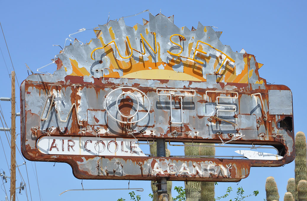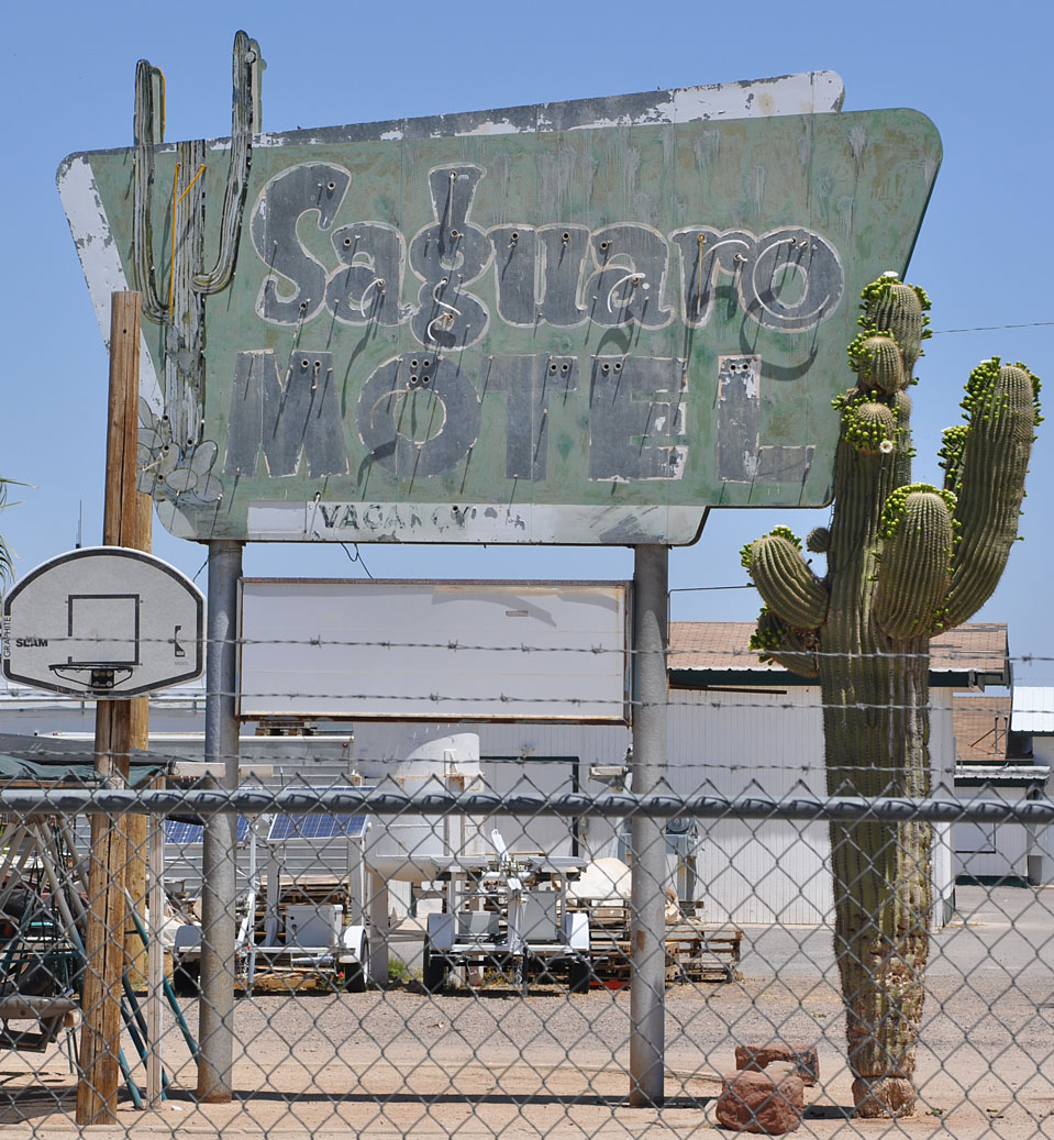From Gila Bend. The lower part of the sign must have been tacked on later — and an interesting solution to wrap-around that balcony: