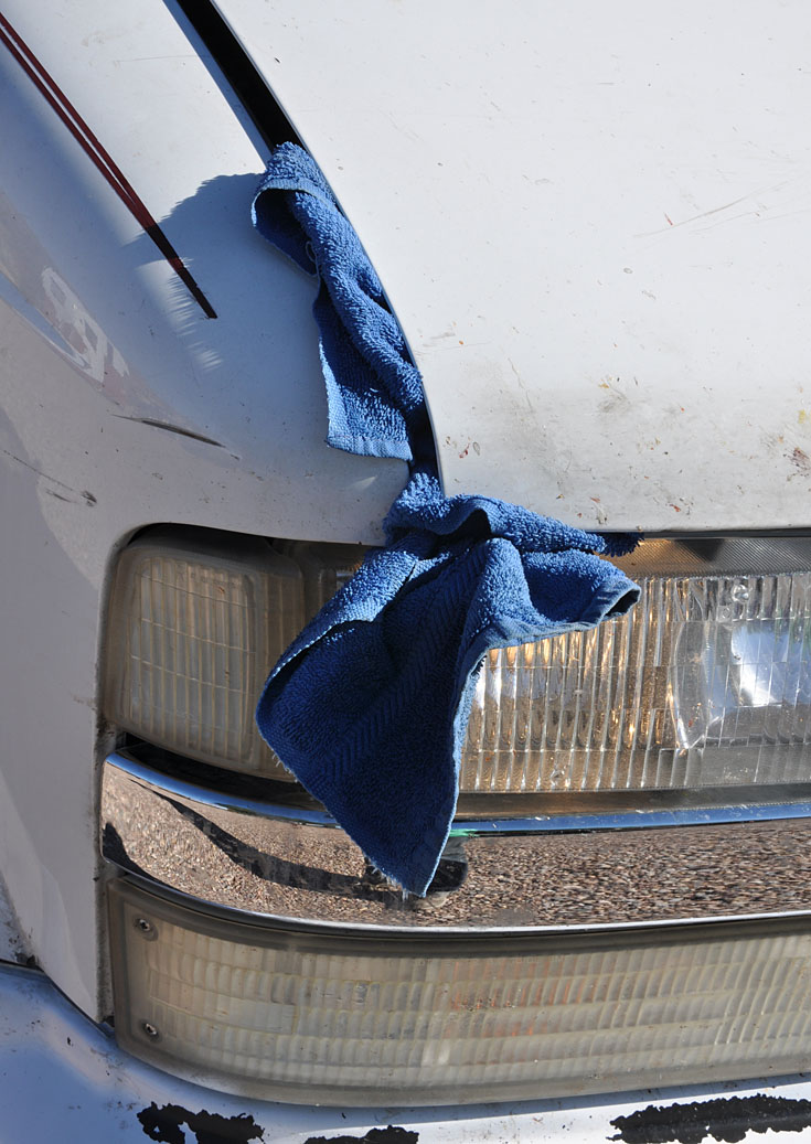 And speaking of vehicles. This is how I’ve been driving her around for the past week or so. This hand towel pretty much stops the squeaky hood sound. It’s humiliating enough with her bruises and misaligned headlights — but this is really over the top. Poor Sparkle…