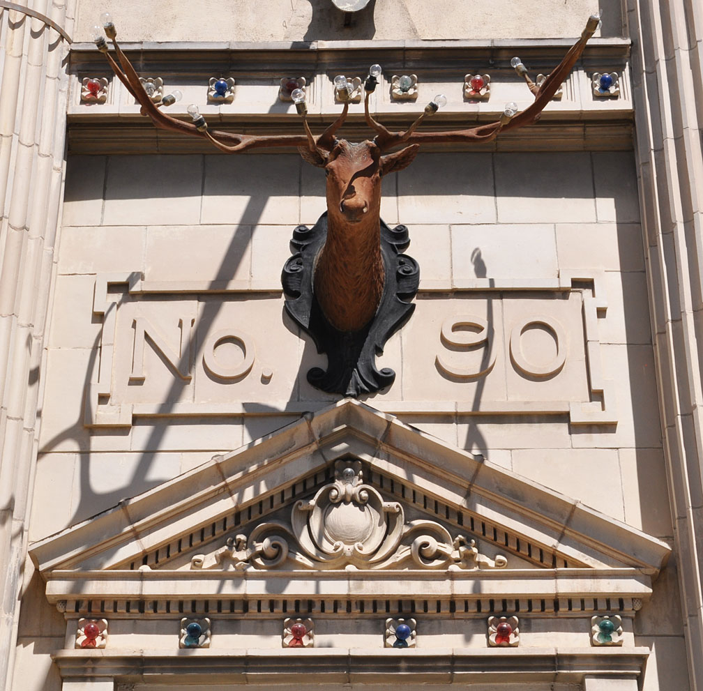 Same building — I hope you can make out that there are colored lightbulbs on the building and in the elk’s antlers (remember, you can click for a larger photo):