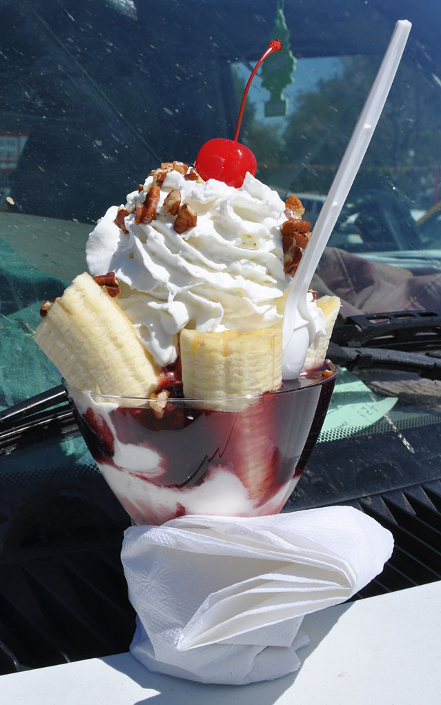 But I forgive them for that. After all, it was HOT. 90 something maybe? And I refused to turn on the A/C since it was Memorial Day and the beginning of summer — and we SHOULD be hot to appreciate the holiday of it all. Anyhow, so this is a sundae. There was a better name — but anyway, it’s like a small banana split — but just the one flavor (vanilla soft serve) and vertical presentation. Lots of syrup choice — I went with black raspberry. It. Was. Unreal.