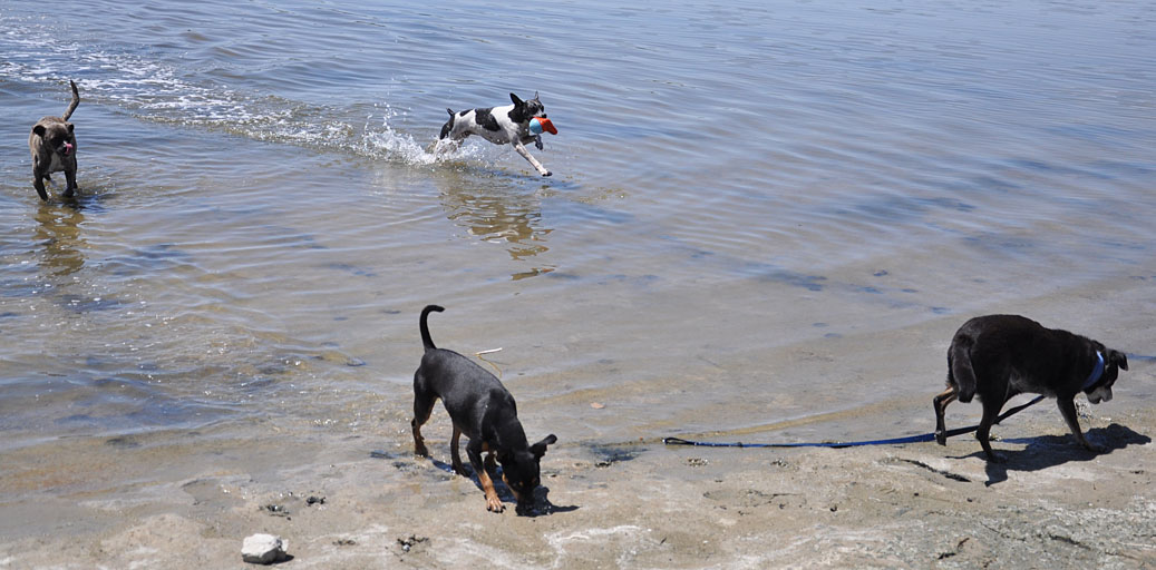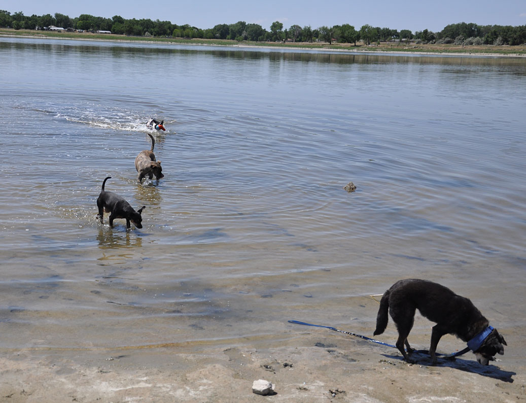I spied a lake in Pueblo — and it was hot — and the dogs hadn’t been swimming in a while. So off we traipsed down to the shore. Everybody in — woo hoo! Then I noticed — lots of white on the shore — must be a salt lake? And then I noticed lots of — uh oh — dead fish. So my goal was to keep everybody IN the water swimming and eating the floaties that I was throwing in.
