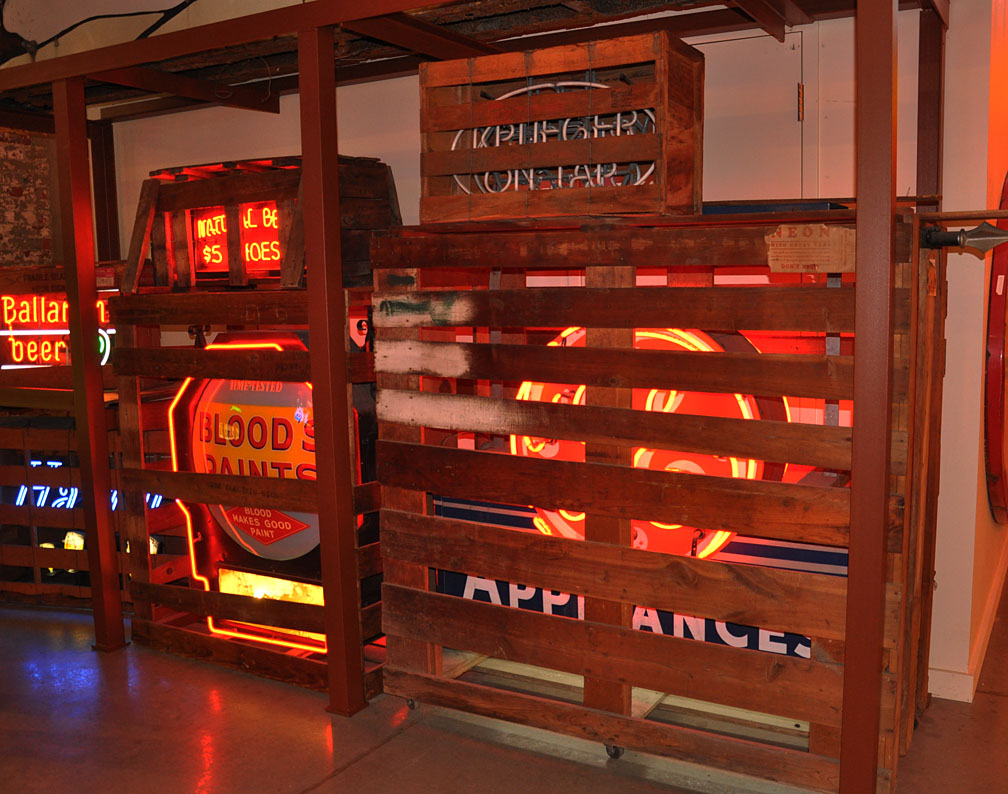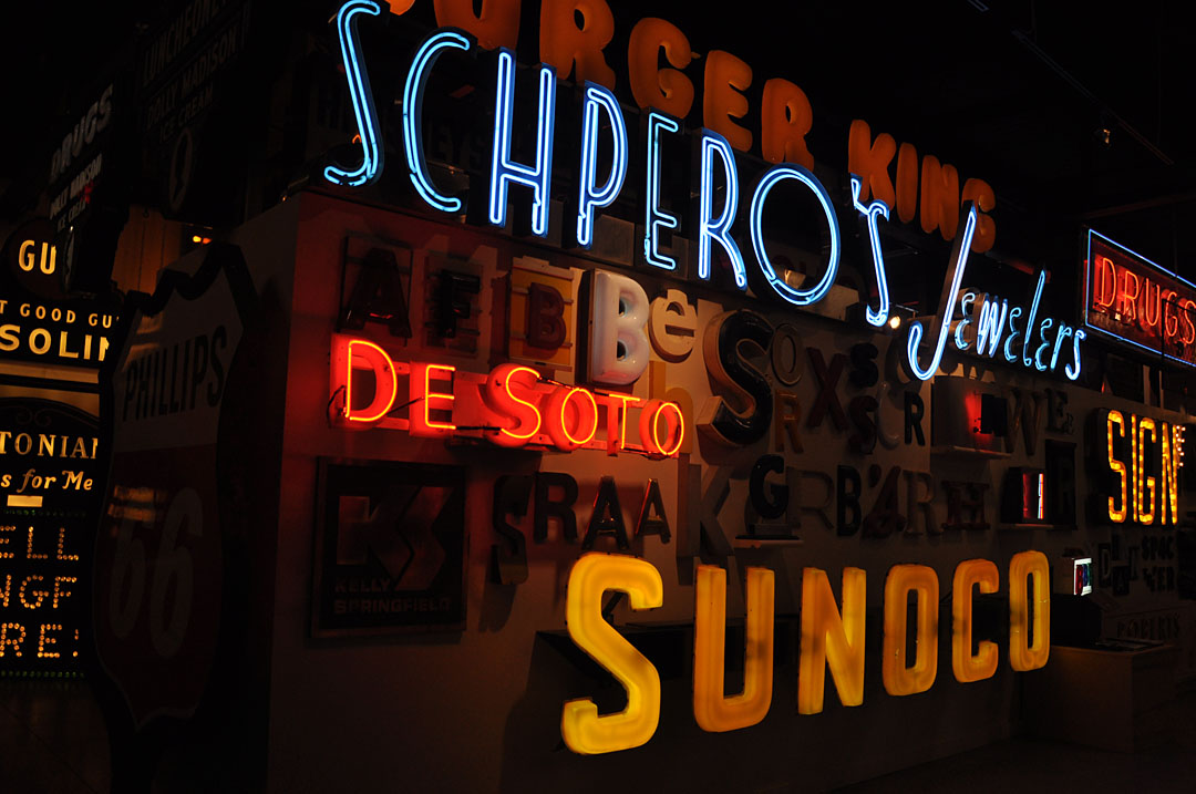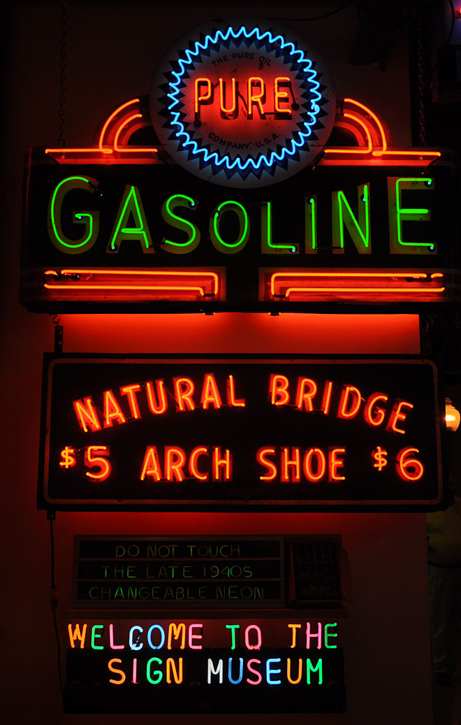 The museum is, of course, incredible in every way. Yes, tons of big and small neon signs of every variety. The lower “Do Not Touch” and “Welcome” signs are composed of freestanding neon letters that are activated (lit) when placed on the little message board slat. I’m not enough of a neon techie to understand how this is possible:
