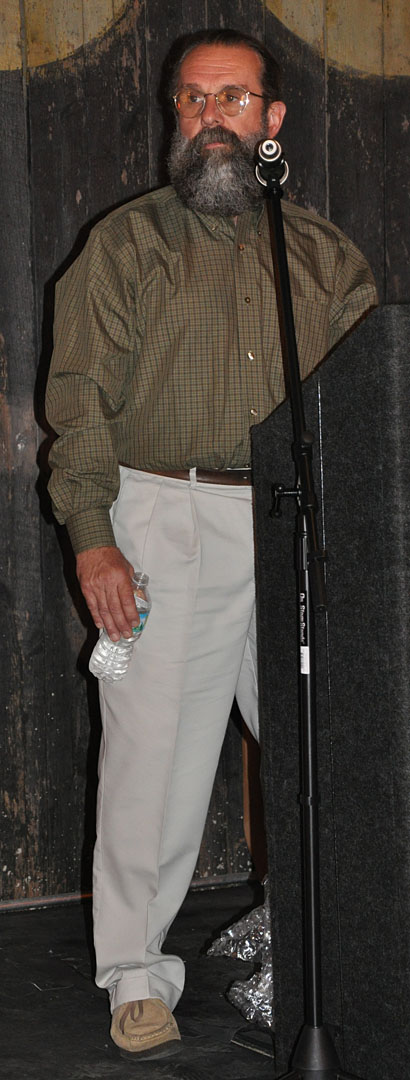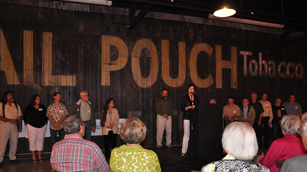 There was a short video shown with interviews and the signs being painted. And the painters in attendance were called to the front of the room. Behind them, well there’s Tod of course, but there’s also a hand-painted Mail Pouch Tobacco sign. It was deinstalled from an old barn, slat-by-slat, and installed here: