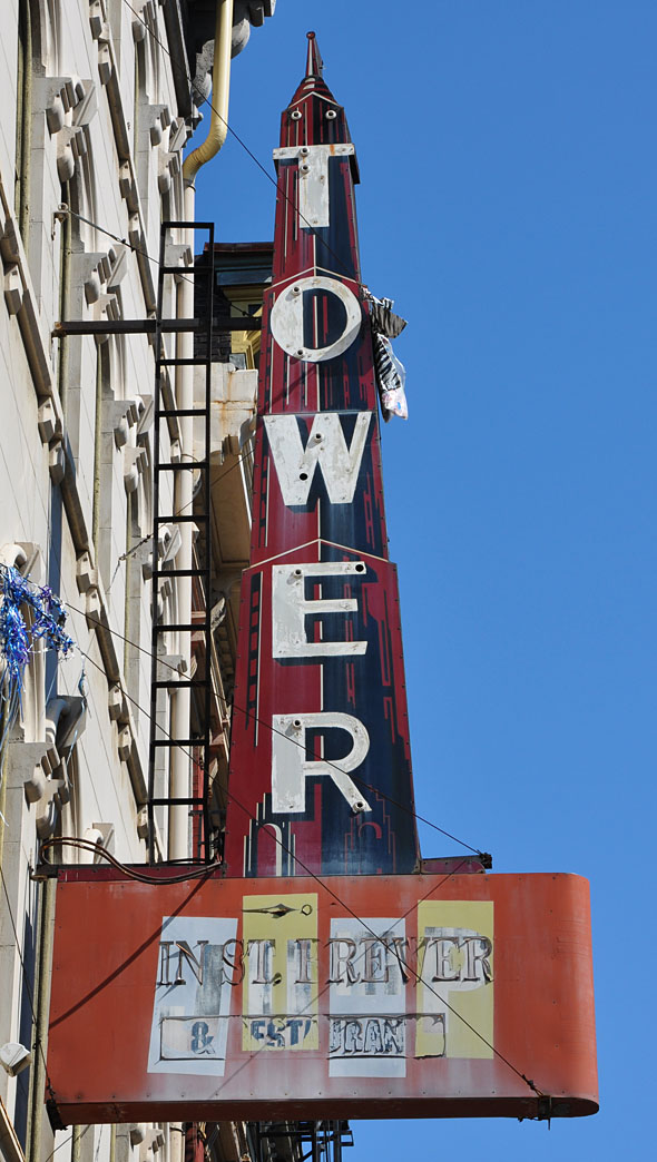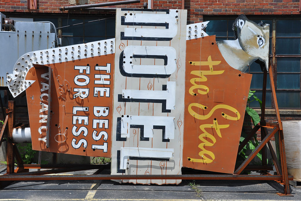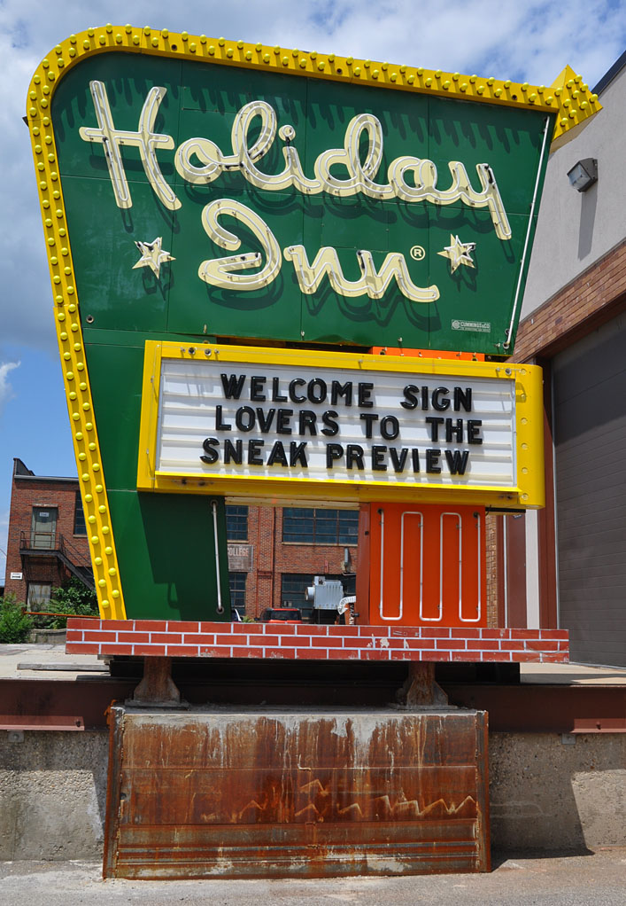 I got some gorgeous sun and clouds for the last day of the trip. The morning was spent boogie-ing around Cincinnati for some reshoots and things I hadn’t known about on previous trips. Then, it was off to the American Sign Museum for the second event: the “Sneak Preview” fundraiser for the museum. For those of you that couldn’t make it, the ASM will be officially opening on June 23 with regularly staffed hours. Don’t balk at the $15 admissions charge — it’s far cheaper than an amusement park and so, SO more exciting. This place is fan-tas-tic and deserves your support. I guarantee you will learn so much about signs and their history from your tour guide. And you will have a blast. Go!