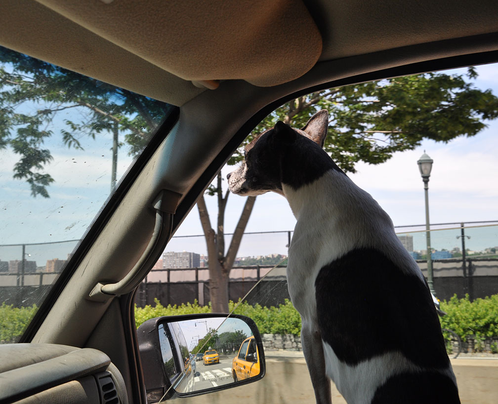 I try to avoid the Lincoln Tunnel since it has more traffic on the West Side Highway to Brooklyn — and a longer view of the Hudson River. But I got in the wrong lane and, oh well. This is just before Nik and Grem started screaming at the top of their lungs and embarrassing the hell out of me. I thought you might like the taxis in the mirror: