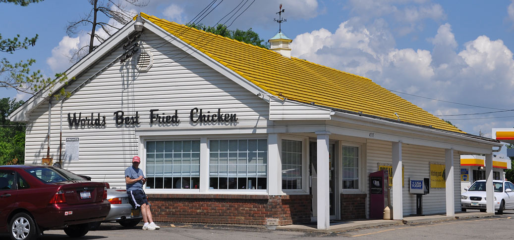 And the restaurant has yellow porcelain enamel roof tiles — plus a chicken topped weather vane. I wonder how many restaurants claim to have the “world’s best fried chicken”?