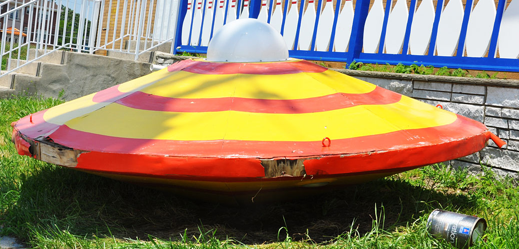 I don’t know where the UFO came from or anything about it. It’s built on a wood frame and it looks like the plastic bubble on top could be lit: